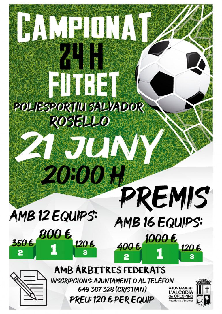 La regidoria d’Esports de l’Ajuntament de l’Alcúdia de Crespins està organitzant un campionat 24 hores de futbol que es desenvoluparà el pròxim 21 de juny en el Poliesportiu Salvador Rosselló. Els equips interessats a participar podran realitzar la inscripció acudint a l’ajuntament i pagant el preu d’inscripció, 120 euros.