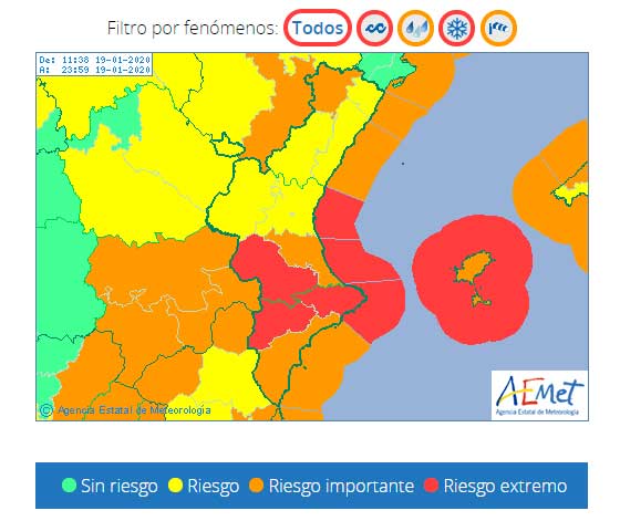 El temporal Gloria, que se prevé deje nieve, lluvia y vientos en la Comunidad Valenciana, llega hoy domingo y la Agencia Estatal de Meteorología (Aemet) ha activado la alerta roja en el interior sur de la provincia de Valencia y norte de la de Alicante a partir de las 19 horas de esta tarde.