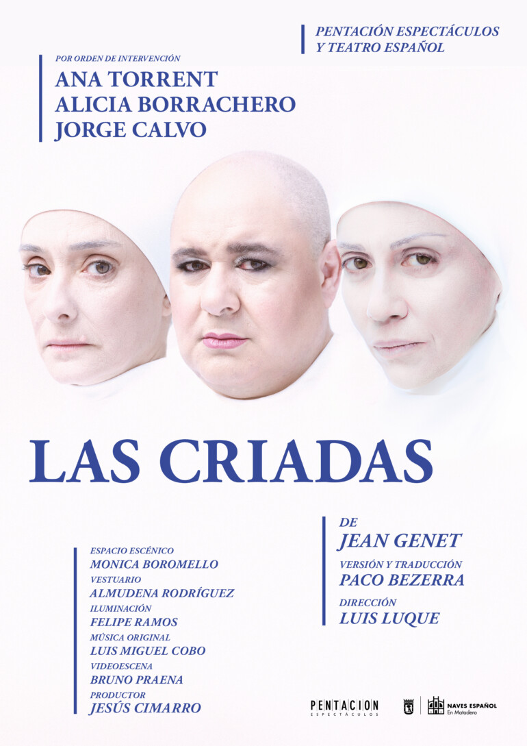 Ana Torrent, Alicia Borrachero y Jorge Calvo protagonizan Las criadas, de Jean Genet, en versión de Paco Bezerra y dirigida por Luis Luque, una función que se estrenó en las Naves del Español (Madrid) con llenos diarios y que se encuentra ahora inmersa en su gira por el territorio nacional. Del 20 al 23 de mayo estará en el Teatro Olympia jueves y viernes a las 19.30 horas, sábado 18.00 horas y 20.30 horas, domingo 18.00 horas.