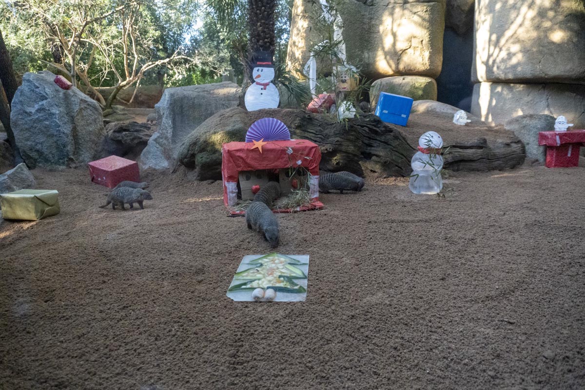 En Bioparc Valencia una celebración tan entrañable como la Navidad se vive intensamente y, en esta ocasión, han sido sus majestades los Reyes Magos de Oriente quienes han acudido a su tradicional cita con los animales. Para las crías de elefante, Makena y Malik y las de chimpancé, Cala y Ekon, con el pequeño Djibril, ha sido un “no parar”; las curiosas mangostas rayadas han demostrado su habilidad y los leones se han recreado haciendo gala de su ferocidad. El asombro ante la decoración de sus recintos y el apetitoso contenido de los regalos supone un aliciente extra y forma parte de la técnica denominada “enriquecimiento ambiental” que aplica el equipo de cuidado animal para favorecer los estados físicos y emocionales positivos, lo que repercute en un mayor bienestar.
