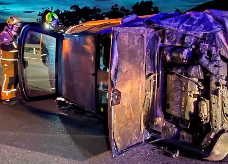 Un aparatoso accidente de tráfico, como se puede apreciar en la imagen, se saldó milagrosamente sin heridos tras volcar un turismo en la autovía A7 dirección Murcia, a la salida del Aeropuerto de Alicante-Elche.