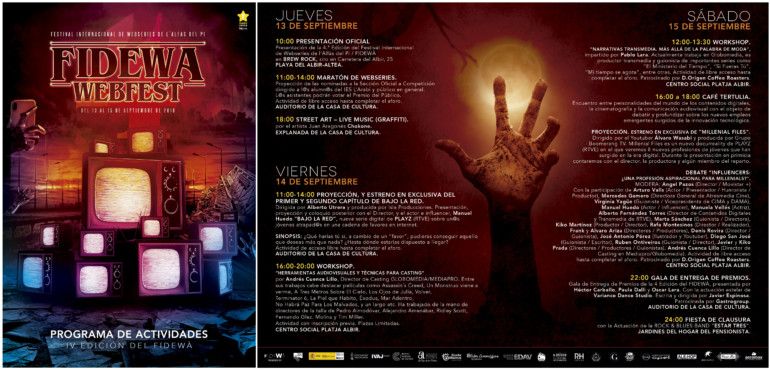 El programa del festival, que se desarrolla del 13 al 15 de septiembre, incluye maratón de webseries, el estreno y primeros capítulos de ‘Bajo la red’ y de ‘Millenial Files’, junto a ‘workshops‘ sobre narrativas audiovisuales y técnicas para casting y narrativas transmedia, así como café tertulia sobre empleos emergentes surgidos de la innovación tecnológica y un debate sobre influencers. El programa completo se puede consultar en www.fidewa.es