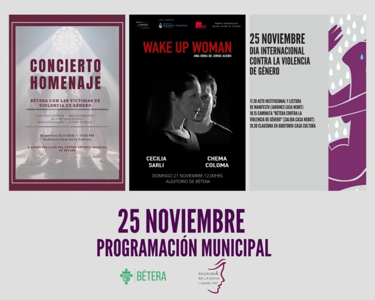 Con motivo de la conmemoración del 25 de noviembre, del Día Internacional Contra la Violencia de Género, el Ayuntamiento de Bétera, a través de la concejalía de Mujer e Igualdad, ha organizado diversos actos con el propósito de mantener unas políticas municipales activas en materia de sensibilización y concienciación frente a la violencia de género y sus múltiples manifestaciones.