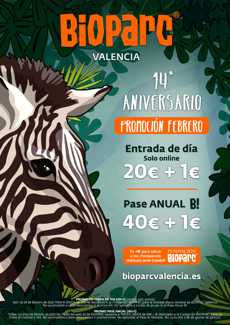 Este mes de febrero Bioparc quiere celebrar su 14º cumpleaños haciendo más accesible la visita, tanto la de un día, como el pase anual. De esta forma, este aniversario “con causa” incluye una promoción con las entradas online a 20€+1€ y el Pase anual B! a tan solo 40€+1€, para disfrutar todo un año del que está considerado uno de los mejores parques de animales del mundo. Una vez más, el “+1€” se destinará, a través de la Fundación Bioparc, a proteger a una de las especies en mayor peligro de extinción, los chimpancés, apoyando la intensa labor que realiza en África el Instituto Jane Goodall.