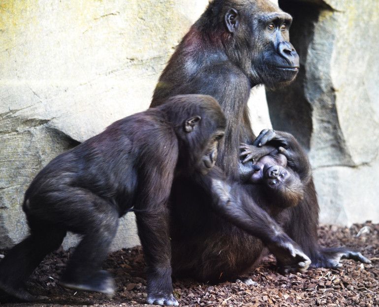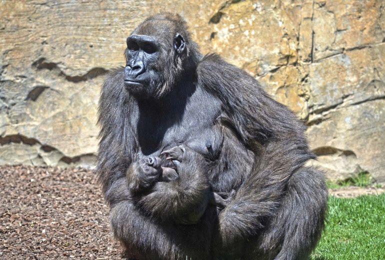La familia de gorilas de Bioparc Valencia, con cuatro crías, ofrece una imagen realmente enternecedora, como un “documental en directo”, pues la evolución del bebé está siendo muy positiva y puede verse cómo mama y se coge con fuerza al pelaje de la madre. Todo discurre bajo la atenta mirada de Mambie, el macho “espalda plateada” y padre, además de Ebo y Félix, de Virunga de 2 años y Pepe de 13 meses.