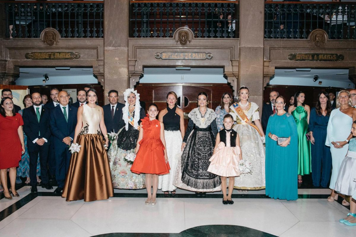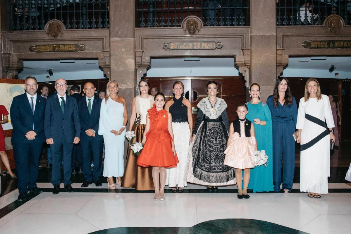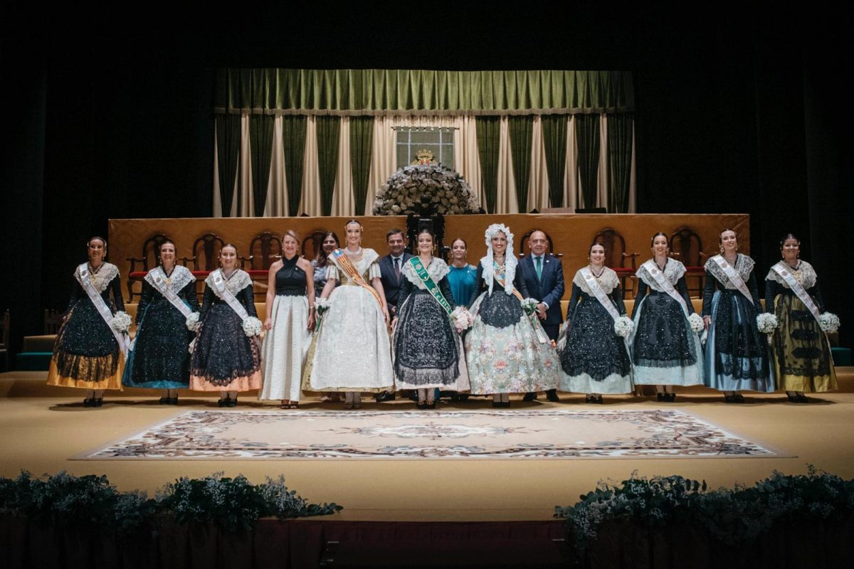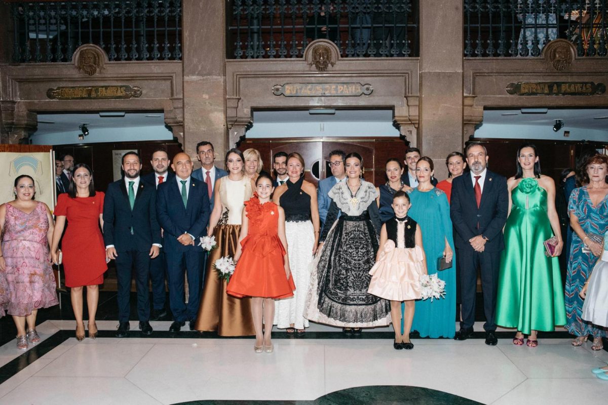 Posteriormente han ocupado su lugar en el escenario, la alcaldesa de la ciudad, Begoña Carrasco y el Presidente de Junta de Festes, Raúl Collazos para proceder a la imposición de bandas a las 19 Madrinas de cada una de las comisiones de sector.