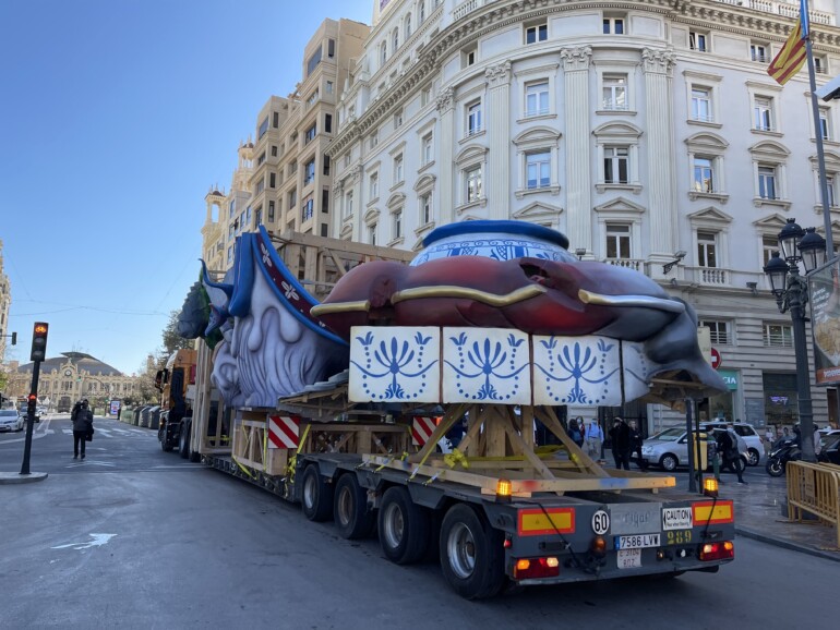 Sobre las 16 horas de este martes, han llegado a la plaza del Ayuntamiento de València las primeras piezas de la falla municipal, ‘Protegeix allò que estimes‘, donde ya esperaban sus artífices, Alejandro Santaeulalia y Dulk, acompañados por el concejal de Cultura Festiva y presidente de Junta Central Fallera, Carlos Galiana.