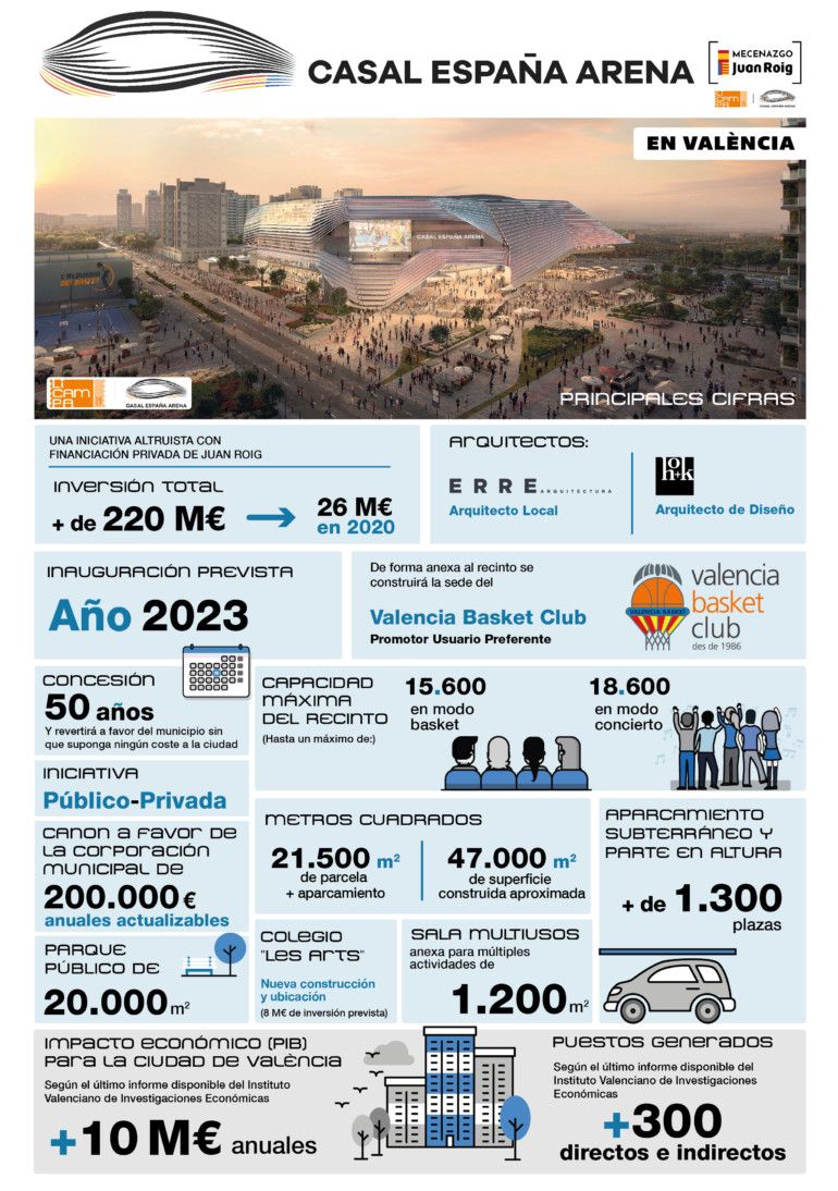 Asimismo, hoy se ha presentado el nombre de este recinto, “Casal España Arena”. Casal, porque representa la esencia de la actividad de los barrios de València, y esto es lo que va a representar el Arena, un espacio de encuentro donde miles de personas se reunirán para disfrutar de acontecimientos deportivos, culturales y de entretenimiento. España, porque no será solo para la ciudad de València, sino también para la Comunitat y resto del país, cuyo nombre se incluye para que tenga transcendencia internacional, siendo uno de los objetivos el convertirse en un foco de atracción turístico que complemente la extraordinaria oferta que existe en València, en la Comunitat y en España. Y Arena, concepto internacional que recoge a los recintos, pabellones y estadios cubiertos, diseñados específicamente para eventos deportivos, musicales o culturales de máximo nivel; y con una gran visibilidad y para un gran número de espectadores.