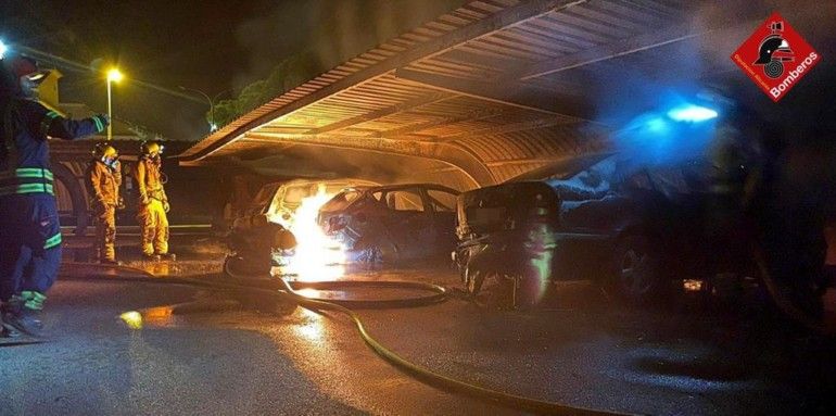 Cuatro vehículos estacionados en este parking se vieron afectados, consiguiendo en su intervención los bomberos no solo extinguir el fuego sino también que éste se propagara a una zona de pinada cercana al lugar del siniestro.