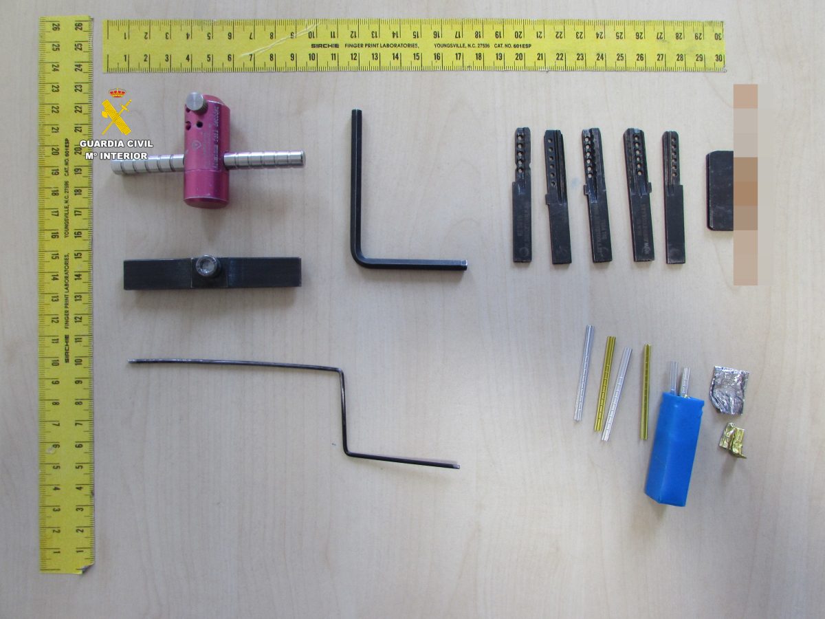 Los hechos tuvieron lugar el pasado 21 de octubre. Agentes de la Guardia Civil sorprendieron a los dos individuos en su vehículo. Durante el registro, les intervinieron 266 euros en metálico, varias joyas y piezas de oro de origen injustificado, además de las herramientas de cerrajería específicas para el impresioning, según ha informado el Instituto Armado.