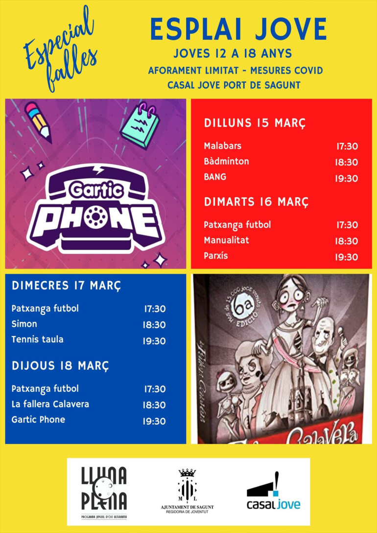 Se trata del Esplai que se lleva a cabo cada lunes, miércoles y viernes, pero esta semana se realizará a lo largo de toda la semana, bajo el concepto Esplai Falles, y no se necesita inscripción previa. Asimismo, la programación para hoy está comprendida por una pachanga de fútbol, manualidades y parchís; mañana miércoles, día 17, habrá una pachanga de fútbol, el juego Simon y Ping Pong. Por último, el jueves el día estará compuesto por una pachanga de fútbol, el juego La Fallera Calavera y el juego Gartic Phone.