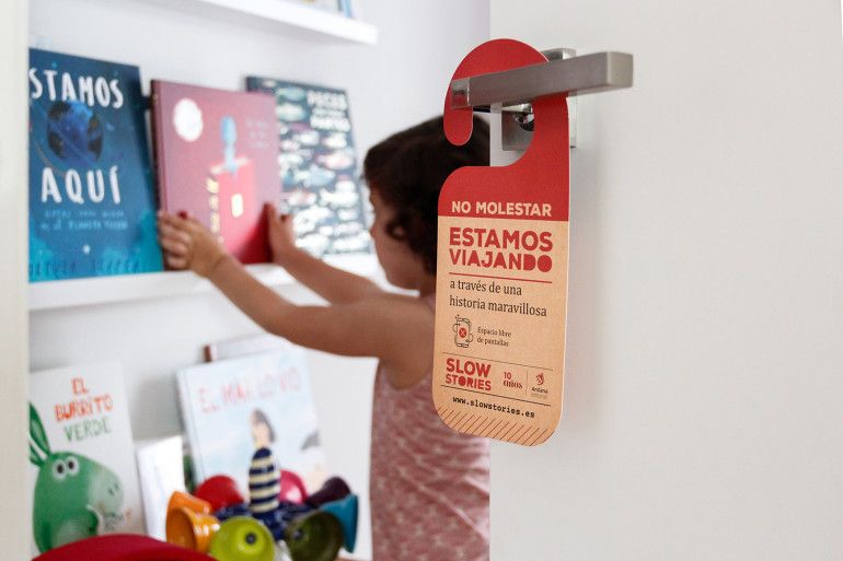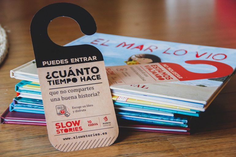 «La puesta en escena de Slow Stories es ya toda una declaración de intenciones: un cartel como el que cuelga en el pomo de la puerta de las habitaciones de hotel pero con un mensaje muy diferente y especial: «No molestar. Estamos viajando a través de una historia maravillosa. Espacio libre de pantallas «. Esta será, precisamente, una de las recomendaciones de Slow Stories: no meter en la habitación ningún dispositivo móvil que pueda romper la atmósfera de la narración y el ambiente de la magia. El objetivo de la iniciativa es conseguir bajar el ritmo, alejar las distracciones y disfrutar del momento de compartir libros e historias con los más pequeños de la casa», explica Ricard Peris, editor de Andana.