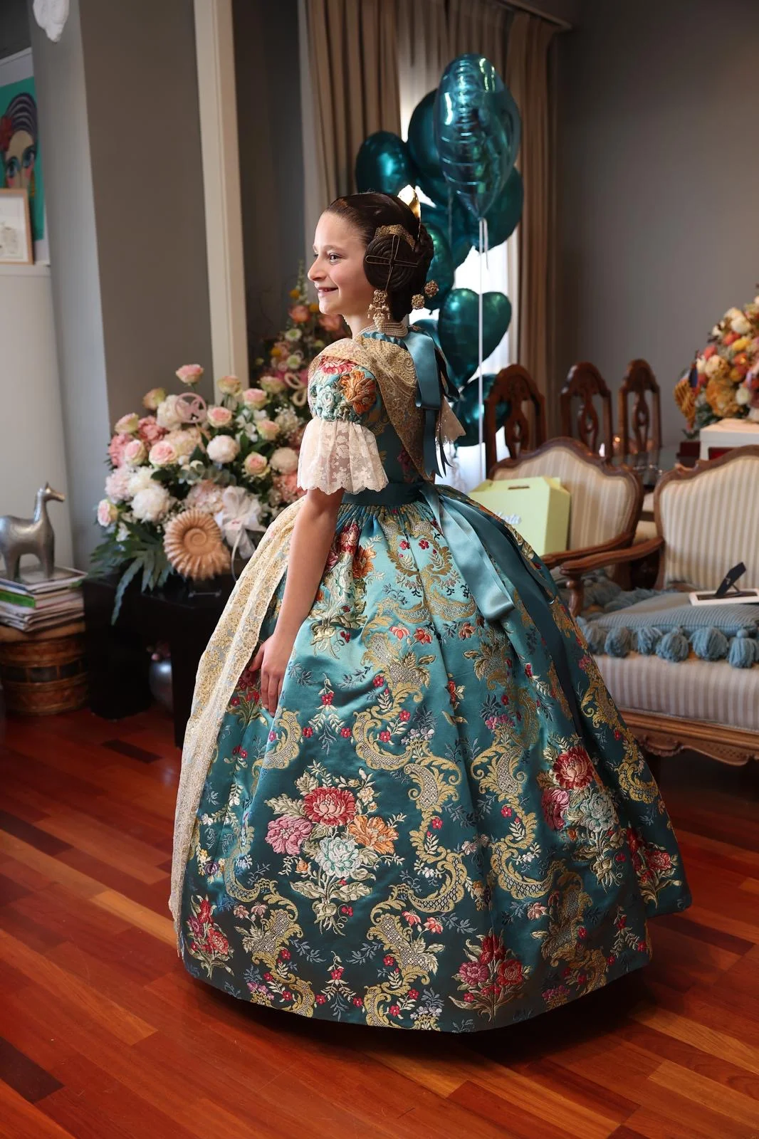 El color elegido, inspirado en la claridad y luminosidad del día, simboliza la «pureza y frescura» que caracterizan a la máxima representante infantil. Tejido por la prestigiosa firma Vives y Marí, el espolín es una obra de artesanía pura: una urdimbre de seda natural con 31 tramas diferentes, 26 de ellas de seda para dar vida a las flores y hojas, acompañadas por tres metales que aportan distinción a la pieza.