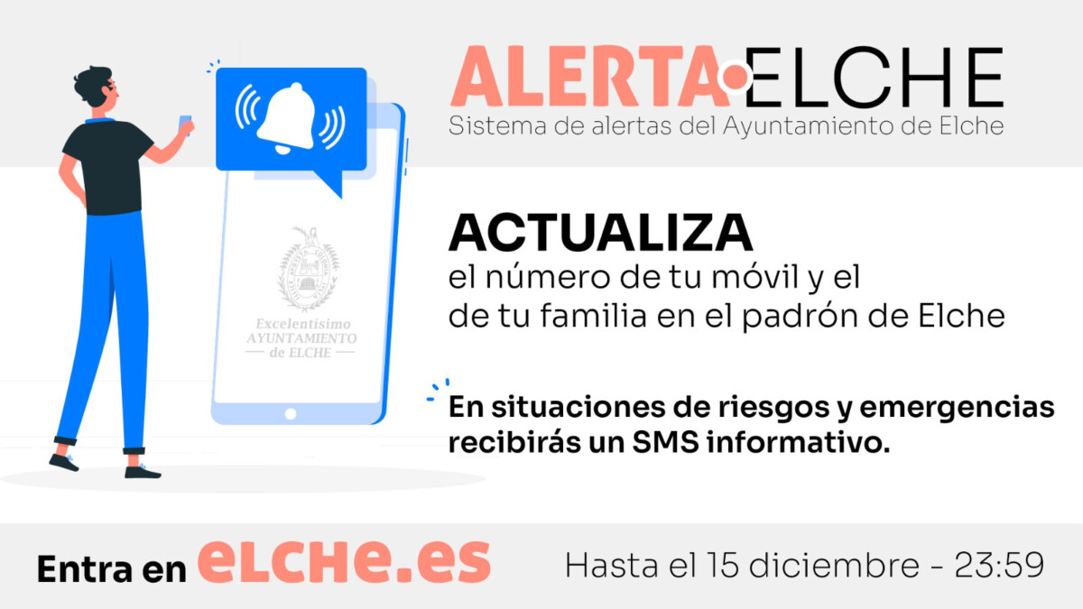 El próximo domingo 15 de diciembre a las 23.59 horas es el plazo que tienen los ilicitanos para actualizar sus teléfonos móviles en el padrón municipal y así incorporarse al sistema de alertas creado por el Ayuntamiento de Elche. Una iniciativa con la que podrán recibir a través de SMS cualquier aviso ante situaciones de riesgo o emergencia. Este mensaje redirige a la web www.elche.es/SOS para ampliar y verificar que los datos son correctos, así como las medidas que deben adoptarse.