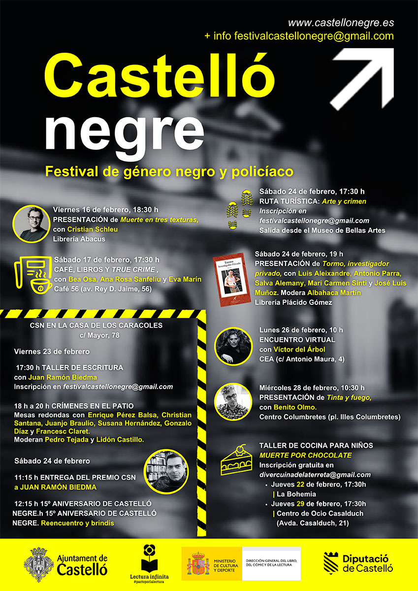 El Patronato de Turismo de Castellón ha presentado la programación del XV Festival Castelló Negre en una edición especial que incluirá un reencuentro para celebrar los 15 años del certamen. Desde el 16 de febrero hasta el 29 se irán sucediendo una serie de actos en los que se pondrá en valor la esencia del género negro en todas sus vertientes.