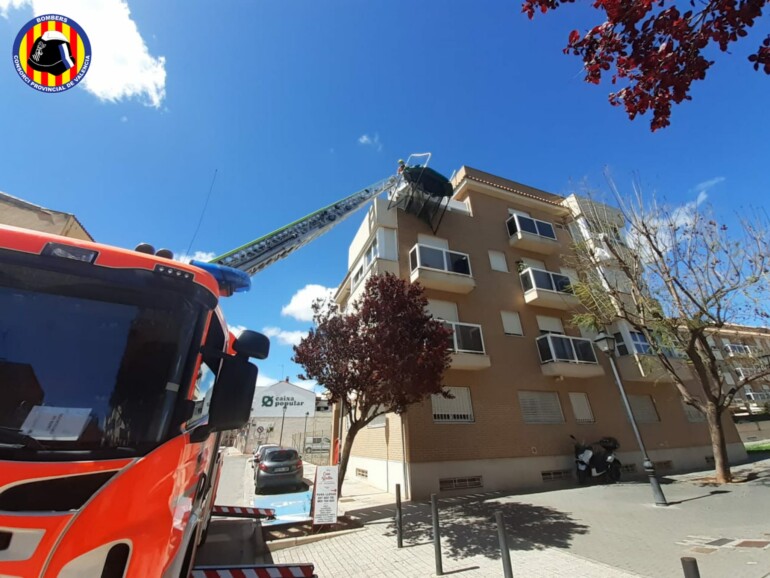 En un ático de Vinalesa, otro vehículo de altura retiraba una cama elástica que amenazaba a caer a la calle desde una terraza en la que estaba ubicada y había sido levantada por el viento.