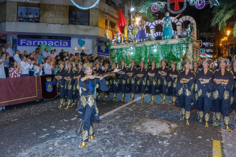 Ja per la nit, la pluja finalment apareixia però no impedia l’eixida de l’esperada capitania Mudéjar del bàndol moro, amb un extens boato en el que participaven prop de 2000 persones, bastat en les relacions comercials que es desenvoluparen en época musulmana a Ontinyent, vinculant-les a Abdalá, el nom amb el que el Joaquín José Cervino va denominar al capità moro del text de les ambaixades, encarnat per Alberto Climent, qui apareixia en una plataforma a muscles de més de 50 homes i dones. L’estructura de la capitania representava una ciutat de l’antic imperi timúrida, actual Uzbekistan, amb gran importància de la indústria tèxtil, que uneix i relaciona l’Ontinyent musulmà amb aquest país amb nexes com ara el “Ikat”, tècnica ancestral de teixir que s’utilitzava a Ontinyent fa 1.000 anys i actualment es continua emprant al país asiàtic. Al boato, a més, s’empraven tratges elaborats en aquest país, i es comptava amb un grup de dansa uzbeka.
