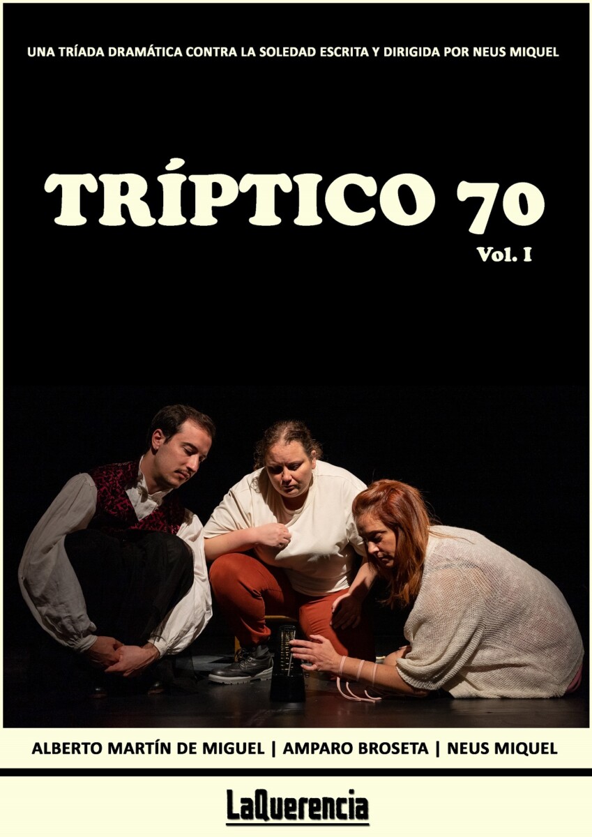 Tríptico 70 vol 1El espacio teatral se divide en tres ambientes en los que cada uno de los personajes de este drama narran su historia, apoyándose en la iluminación, la expresión corporal, sencillos elementos de atrezo y un texto que se adentra en los comportamientos y desencadenantes del aislamiento de tres personajes tan dispares como cercanos, que habitan la soledad como territorio común.