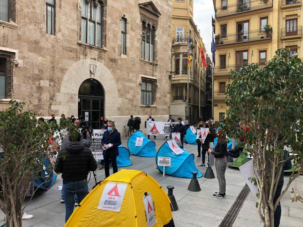 De este modo y partir de hoy, con el eslogan genérico ‘El ocio se planta’ y los hashtags #13A y #13Meses, se llevarán a cabo diferentes actos y mensajes durante la acampada, para reclamar que desde el Gobierno valenciano se aporten soluciones urgentes y realistas y no meros parches económicos. De hecho, aseguran que no darán marcha atrás hasta tener sobre la mesa «un Plan de Rescate Económico que empiece por inyectar ya, los 8 millones de euros comprometidos dentro del Plan Resistir, como ayudas específicas para salvar el ocio nocturno, y que se amplíen los recursos para cubrir todas las solicitudes de las empresas del ocio nocturno que han solicitado estas ayudas». Al respecto, señalan que las previsiones iniciales del Consell «eran las de ayudar solo a 700 empresas, mientras que el número de empresas solicitantes sobrepasa las 1.000».