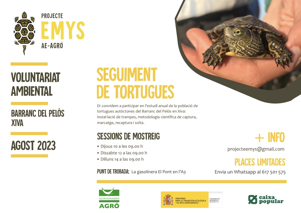Tras cuatro años sin viajar a Chiva, el Proyecto Emys de Acció Ecologista-Agró, iniciativa de ciencia ciudadana que desde sus inicios recibe el apoyo de la Generalita Valenciana, y desde 2021 el de Caixa Popular, vuelve en su 13ª edición a la localidad de la Hoya de Buñol-Chiva.