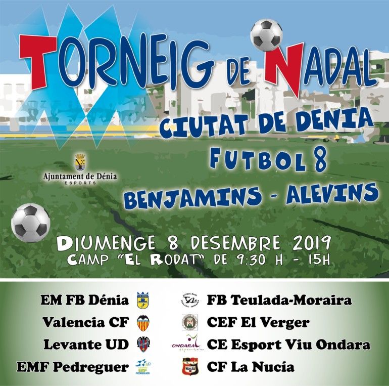 Sis equips benjamins i altres sis alevins disputaran el diumenge 8 de desembre la vintena edició del torneig de Nadal de futbol 8 Ciutat de Dénia al camp El Rodat. Els jugadors i jugadores del València CF, Levante UD, EMF Pedreguer, FB Teulada-Moraira, CE EV Ondara, CEF El Verger, CF La Nucia i l’Escola Municipal de Futbol Base Dénia seran els protagonistes d’esta competició que l’escola organitza amb la col·laboració de la Regidoria d’Esports de l’Ajuntament de Dénia.