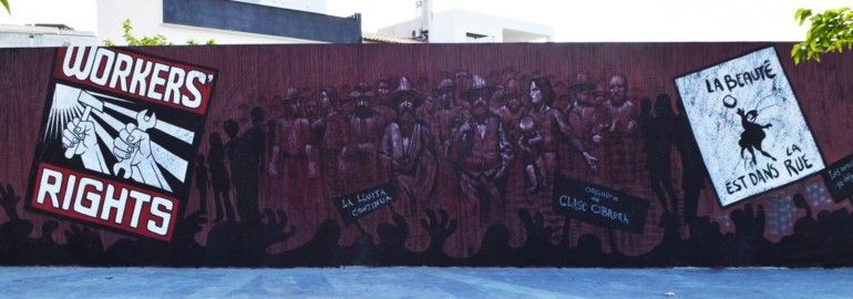El afamado muralista ha ejecutado con su proverbial maestría una imagen que no por icónica y harto conocida -basada en el famoso ‘Novecento’ de Bernardo Bertolucci- deja de representar de forma contundente e inequívoca la lucha del trabajador que todos los años se reedita a sí misma en el Primero de Mayo.