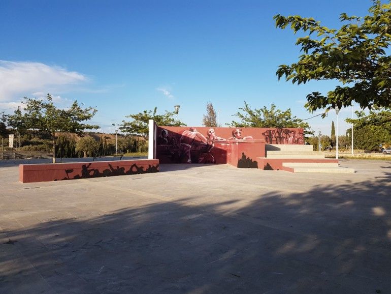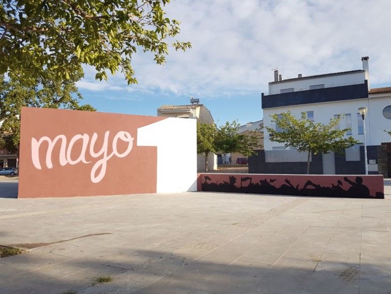 Fotos: Yolanda Marco y Toni Espinar.- La escultura conmemorativa del Primero de Mayo que corona la plaza del mismo nombre en Cheste ha encontrado en el arte mural de Toni Espinar y los Wall Arttitude su remate perfecto.
