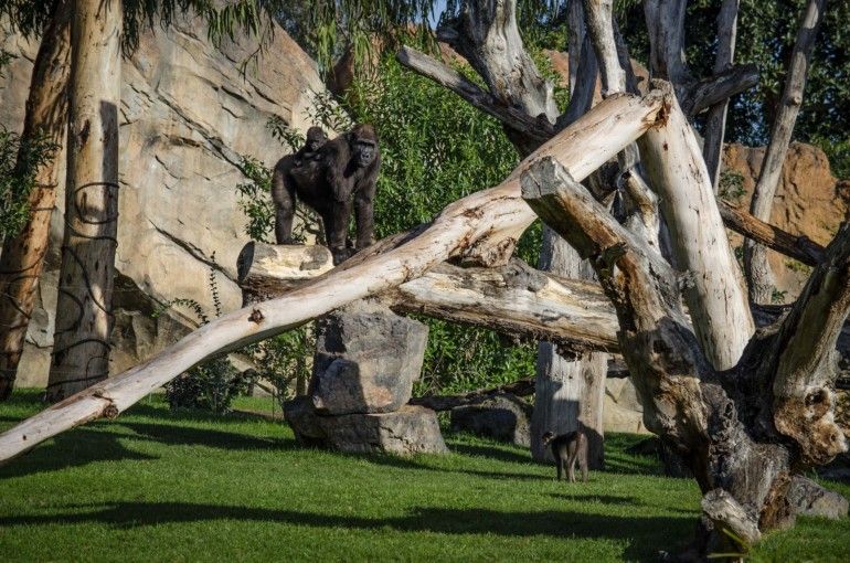 Frente a ellos, en la misma zona de África ecuatorial se encuentran los chimpancés (Pan troglodytes) donde destaca el pequeño Coco quien próximamente cumplirá 19 meses. A pocos metros, descubrimos al grupo reproductor de gorilas occidentales de costa (Gorilla gorilla gorilla) formado por el macho Mambie, las hembras Ali, Nalani y Fossey, y las 4 crías nacidas en Valencia: Ebo de 7 años, Virunga de 3, Pepe que cumple 2 años en marzo y Félix que tendrá 1 año en abril. Desde hace unas semanas, en este mismo hábitat se está llevando a cabo la introducción del grupo reproductor de otra especie de primate, mangabeys de coronilla blanca (Cercocebus atys lunulatus), formado por 5 individuos: un macho, Vito, 2 hembras Hope y Torcuata y las 2 crías nacidas en 2017 y 2019. Si la evolución sigue siendo tan positiva, en breve, podremos observarlos durante todo el día con los gorilas, lo que supone un hito ya que Bioparc Valencia es el único centro en España donde contemplar estas dos especies en grave peligro de extinción en el mismo espacio.