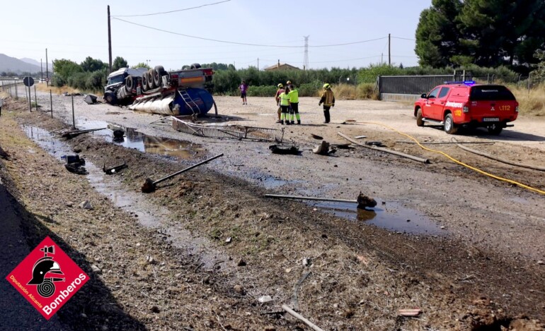 Herido un conductor tras volcar con su camión cisterna en la A-31 sentido Alicante