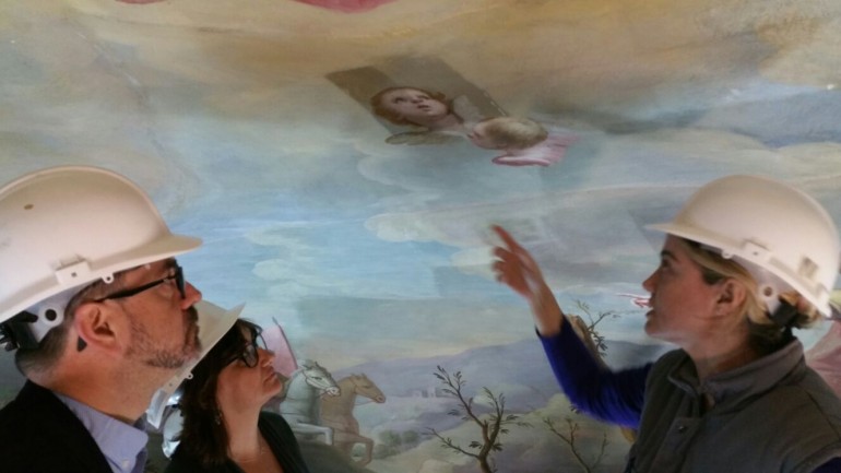 El IVC+R está interviniendo en la consolidación de las grietas, la limpieza de cada uno de los paños de pintura mural, la reposición de faltantes y la reintegración cromática de los faltantes.
