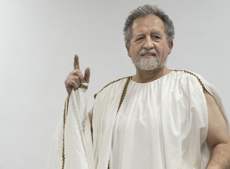 En el marco del ciclo de Conferencias Blancas del centro universitario de la Plana Baixa, Martí ha entrado en la sala caracterizado como el célebre filósofo griego, fundador de la Escuela de Atenas, para de esta guisa pronunciar su conferencia.
