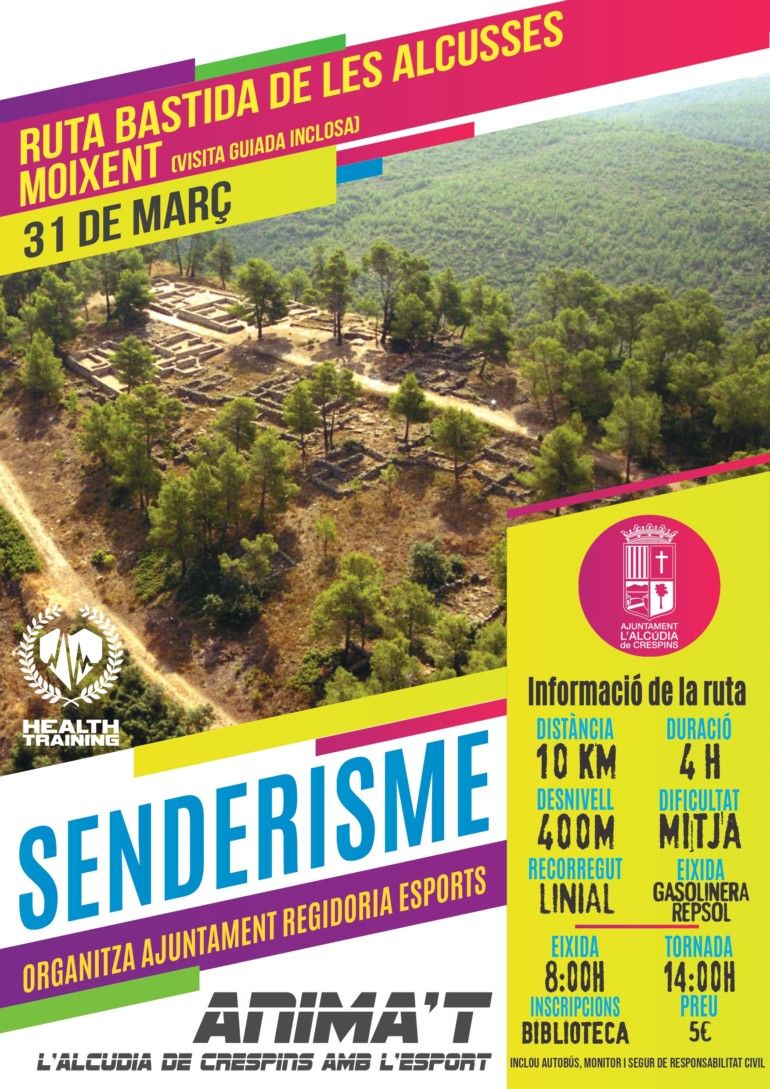 L’Alcúdia de Crespins prepara una nova ruta senderista a Moixent. En aquesta ocasió la travessia, que recorrerà la Bastida de les Alcusses, està programada per al diumenge 31 de març pel que el termini d’inscripció comença aquest dijous dia 14 i finalitza el divendres dia 29. Els interessats a participar hauran d’acudir a la Biblioteca de la localitat i pagar 5 euros per a apuntar-se ja que les places estan limitades a 30 participants.