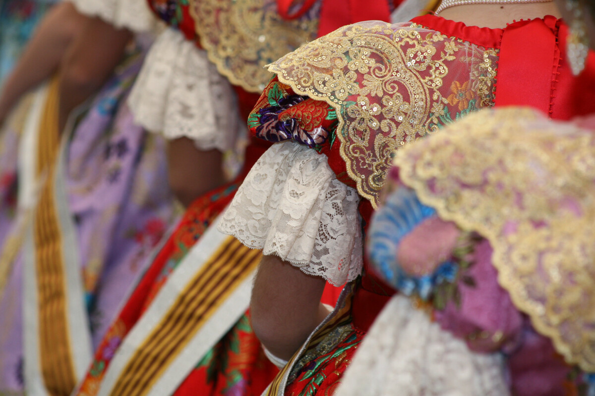 De igual forma ocurre en el trabajo de la seda. La indumentaria valenciana, ya sea de hombre o mujer, niña o niño, se cimenta en la seda, en el arte de entrelazar esos hilos que dan forma a verdaderas joyas artesanales y que lucimos orgullosos cada vez que podemos. El barrio de Velluters, que ocupa gran parte de esta Agrupación, fue un fiel reflejo de ese trabajo durante muchos años. Trabajo que necesita de una materia principal: la seda.