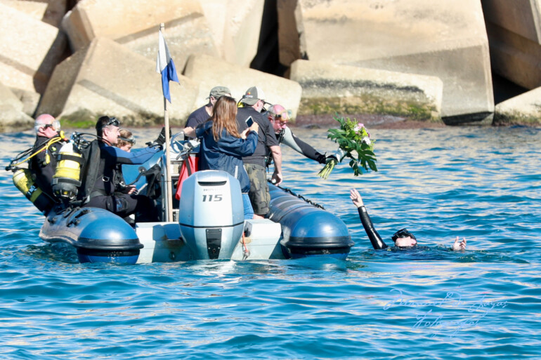 Una vez de vuelta al puerto, se realizó una foto de familia para conmemorar el acto, con la que concluyó una jornada distendida en un gran día de Ofrenda Marinera, agradeciendo la colaboración y las facilidades prestadas por el grupo de submarinistas del GISED Valencia, el Real Club Náutico de Valencia, y Guardia Civil.