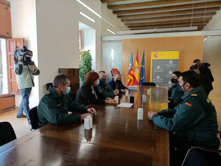La delegada del Gobierno ha recibido esta mañana al general jefe de la VI Zona de la Guardia Civil, Arturo Prieto, al coronel jefe de la Comandancia de Valencia, Antonio Fernández de Luz, y a tres de los agentes que participaron en la evacuación de la residencia de Moncada, Juan Olivares, Jairo Aldonza y Coromoto Souto.
