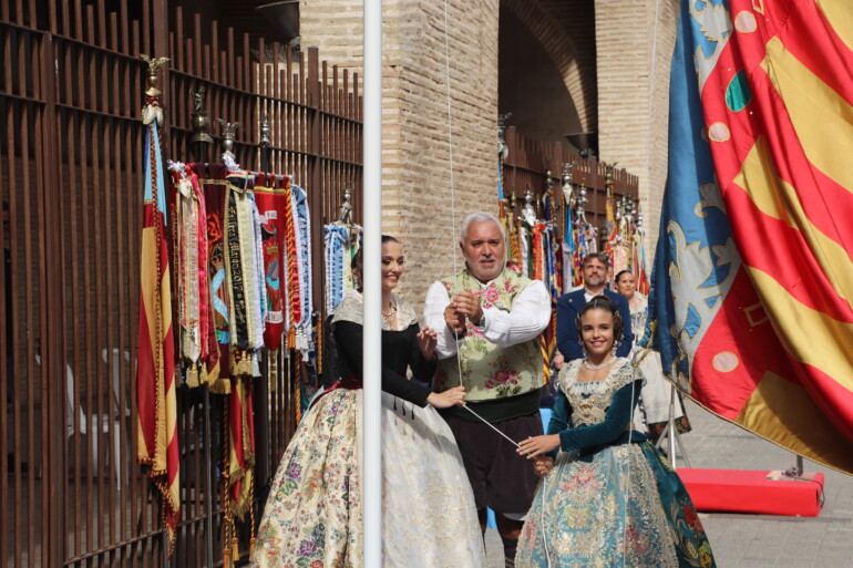 Los grupos de danza hicieron las delicias del respetable desplegando sus mejores artes antes de proceder el nuevo presidente de la Agrupación, Julián Carabantes, junto a las Falleras Mayores de Valencia, Laura y Paula, al izado de la Senyera coronando la plaza.