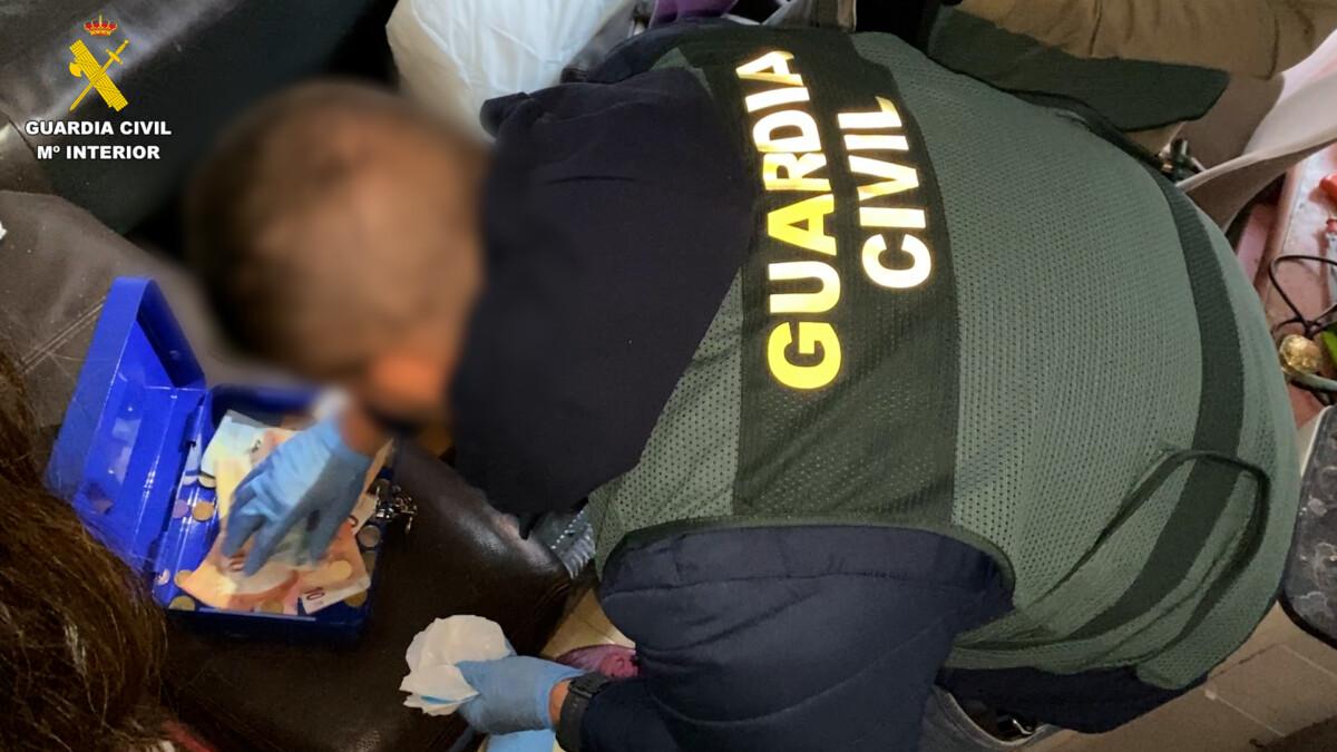 Ante tales hechos, la Guardia Civil practicó una entrada y registro en el citado domicilio, donde se procedió a la detención de 8 personas y a la incautación de multitud de fármacos de venta con receta, 43 gramos de hachís en dosis de un gramo, 443 gramos de cogollos de marihuana en dosis pequeñas, 4 gramos de polen de hachís, 850 envases individuales de plástico con auto-cierre para la distribución de la droga, y 4 básculas para el pesaje. También se intervino unos 851 euros en billetes y varias monedas, así como 2 carabinas de aire comprimido, 2 pistolas simuladas de aire comprimido, bicicletas, patinetes eléctricos, televisores, ordenadores portátiles, teléfonos móviles, relojes, joyería, pequeños electrodomésticos, consolas de videojuegos, taladros, generadores de luz, dron, cañas de pescar, navegadores y bisutería, entre otros.