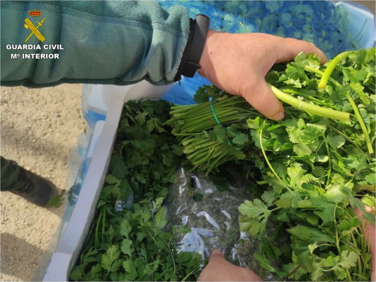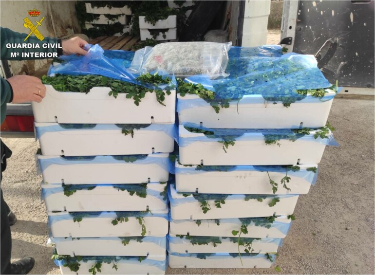 Durante el registro completo de la furgoneta, la Guardia Civil comprobó que dentro de cada caja de perejil los fardos se encontraban perfectamente ocultos en el fondo de los embalajes, para conseguir que pasaran desapercibidos, no solo a la vista, sino también al olfato. Hallaron un total de 58 paquetes prensados al vacío, conteniendo 550 gramos de cogollos de marihuana cada uno