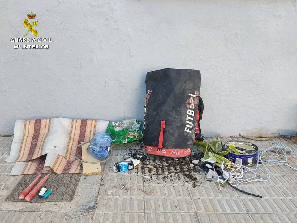 Una vez que los investigadores tuvieron plenamente identificado y localizado al sospechoso procedieron a su detención. En ese momento, portaba una mochila con restos de plantas, trozos de tela, algunos de ellos ya quemados, varios trozos de madera y dos mecheros. En los bolsillos además llevaba dos velas sin utilizar.