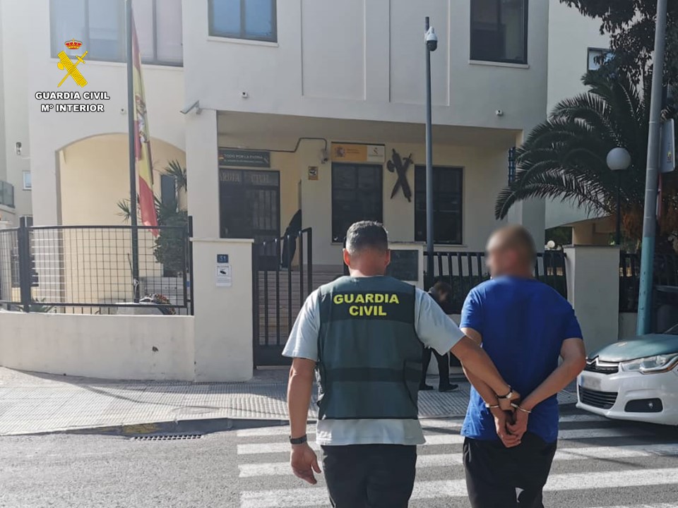 Un agente de la Guardia Civil conduce al detenido al cuartelSe descubrió que el individuo había vendido algunos de los objetos sustraídos a terceros y a comercios locales. Tras acreditar su participación en ocho hurtos, se desplegó un dispositivo de búsqueda y detención, que culminó el 17 de octubre con la detención del sospechoso en el núcleo urbano de Calpe. Además, se le vinculó a un delito de estafa bancaria por el uso fraudulento de una tarjeta bancaria sustraída.