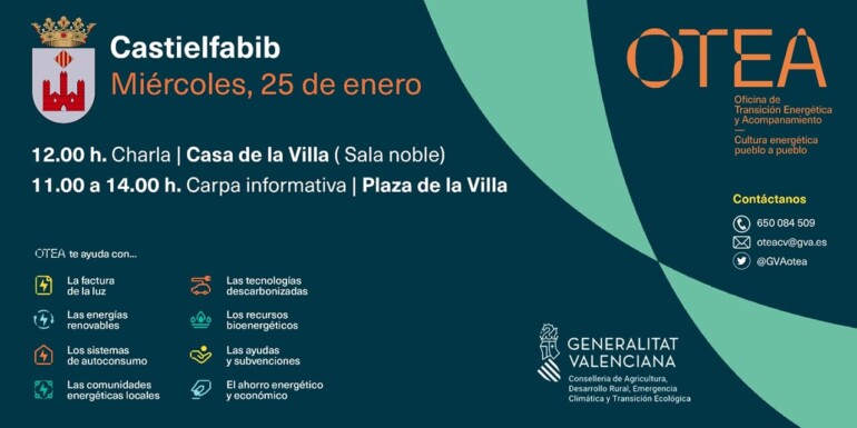 La Oficina de Transición Energética y Acompañamiento (OTEA) visitará Castielfabib el miércoles 25 de enero a partir de las 12:00 horas en la Sala Noble de la Casa de la Villa en una jornada gratuita y para todos los públicos.