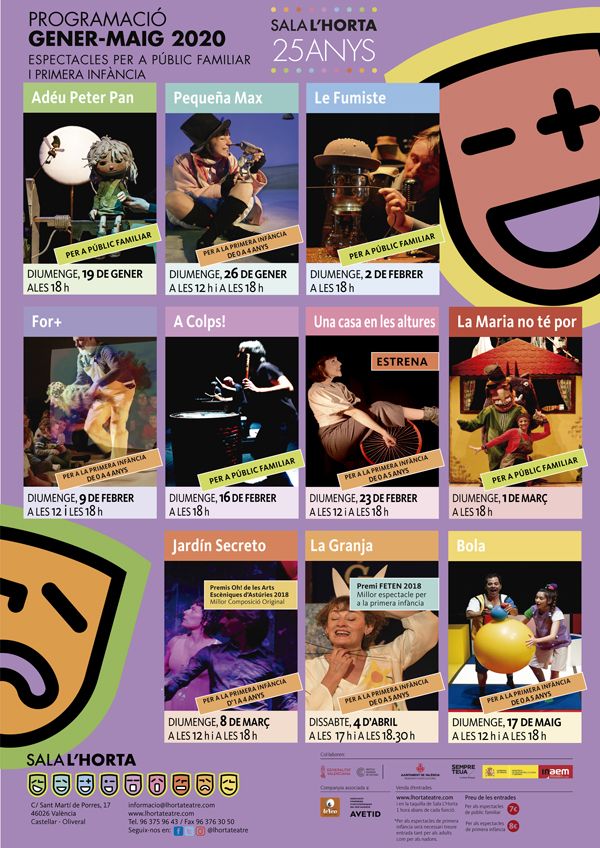 La Sala L’Horta continua celebrant els seus 25 anys d’activitat amb deu propostes escèniques per a Públic Familiar i Primera Infància, programades al llarg de la primera meitat de l’any. Una programació heterogènia, amb espectacles divertits i enriquidors, per acostar el teatre als xiquets i les xiquetes i gaudir en família.
