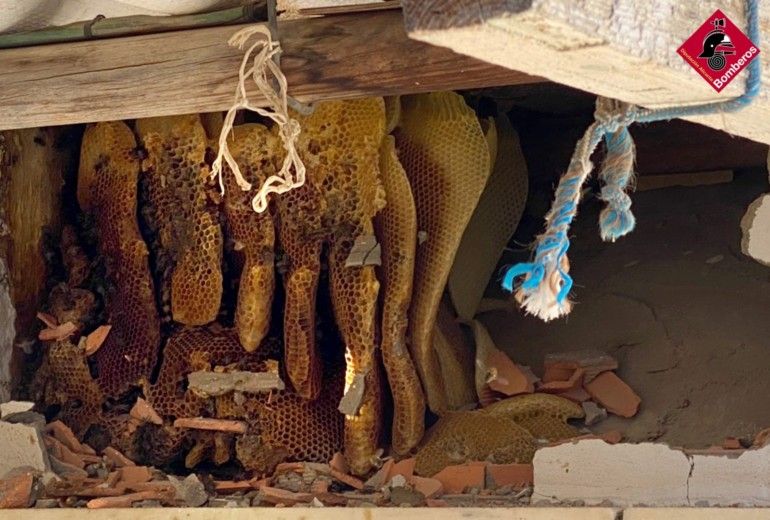 Los bomberos han roto un tabique para sacar la colmena de la cámara y trasladarla. El protocolo habitual de este tipo de situaciones dicta que se cuenta con un apicultor de la zona para que se haga cargo del enjambre una vez extraído.