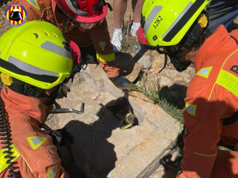 Rápidamente se desplazó una dotación de bomberos del parque de Xàtiva, comprobando que se trataba de un tramo final de acequia tapado con cemento y baldosa, en el que había un pequeño agujero por donde los canes podían sacar un poco la cabeza para respirar, pero no era suficientemente ancho para poder salir.