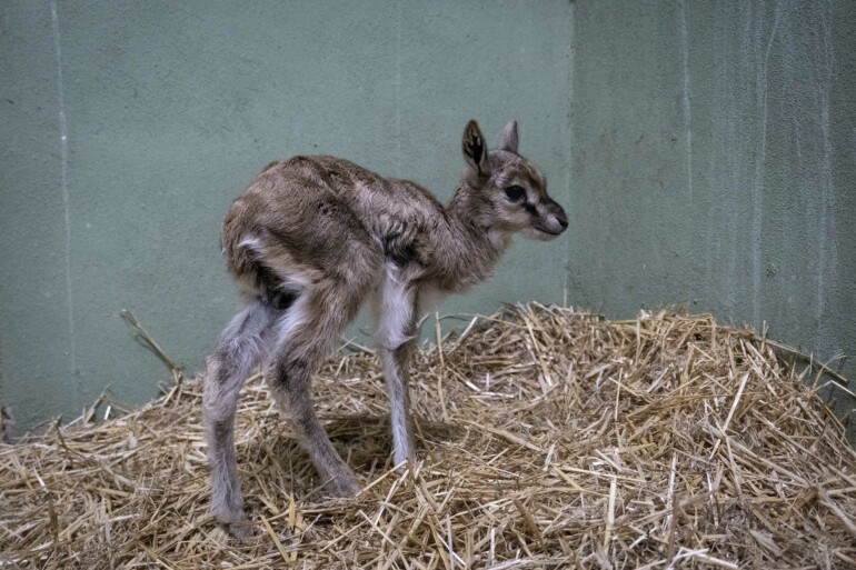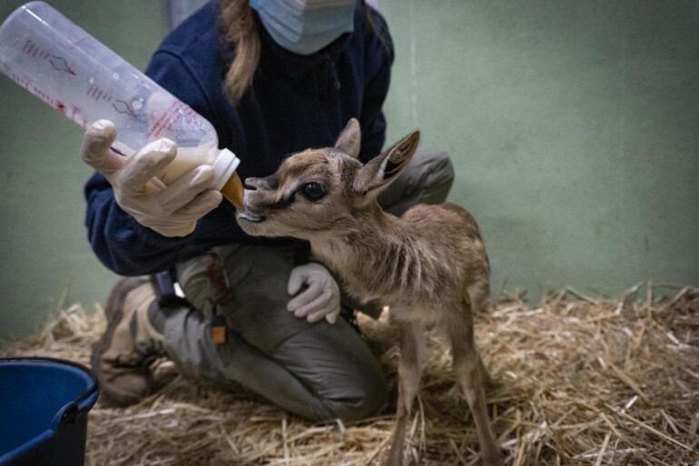 Aunque el equipo técnico de Bioparc tiene amplia experiencia en los cuidados a los recién nacidos, cada cría es un nuevo reto. La operativa de alimentación mediante biberón es especialmente dificultosa en esta especie pues su estrategia de supervivencia es permanecer escondidos de sus depredadores en matorrales, lo que implica que no desarrollan apego al cuidador ni acuden al biberón. Los primeros días se nutrió con calostro que aporta inmunidad y, posteriormente, las cinco tomas diarias de biberón se preparan con una mezcla de leches fresca de vaca y evaporada. Tras la revisión diaria de peso de la cría, se determina la cantidad de alimento para mantener el adecuado crecimiento. Una parte primordial es favorecer su instinto natural y para ello sus cuidadores le estimulan para que orine y defeque, tal y como lo haría su madre. Igualmente, durante varias semanas permanecerá en los recintos interiores acompañado por su progenitora y otra hembra para habituarse al comportamiento de su especie y que esté integrado en el rebaño.