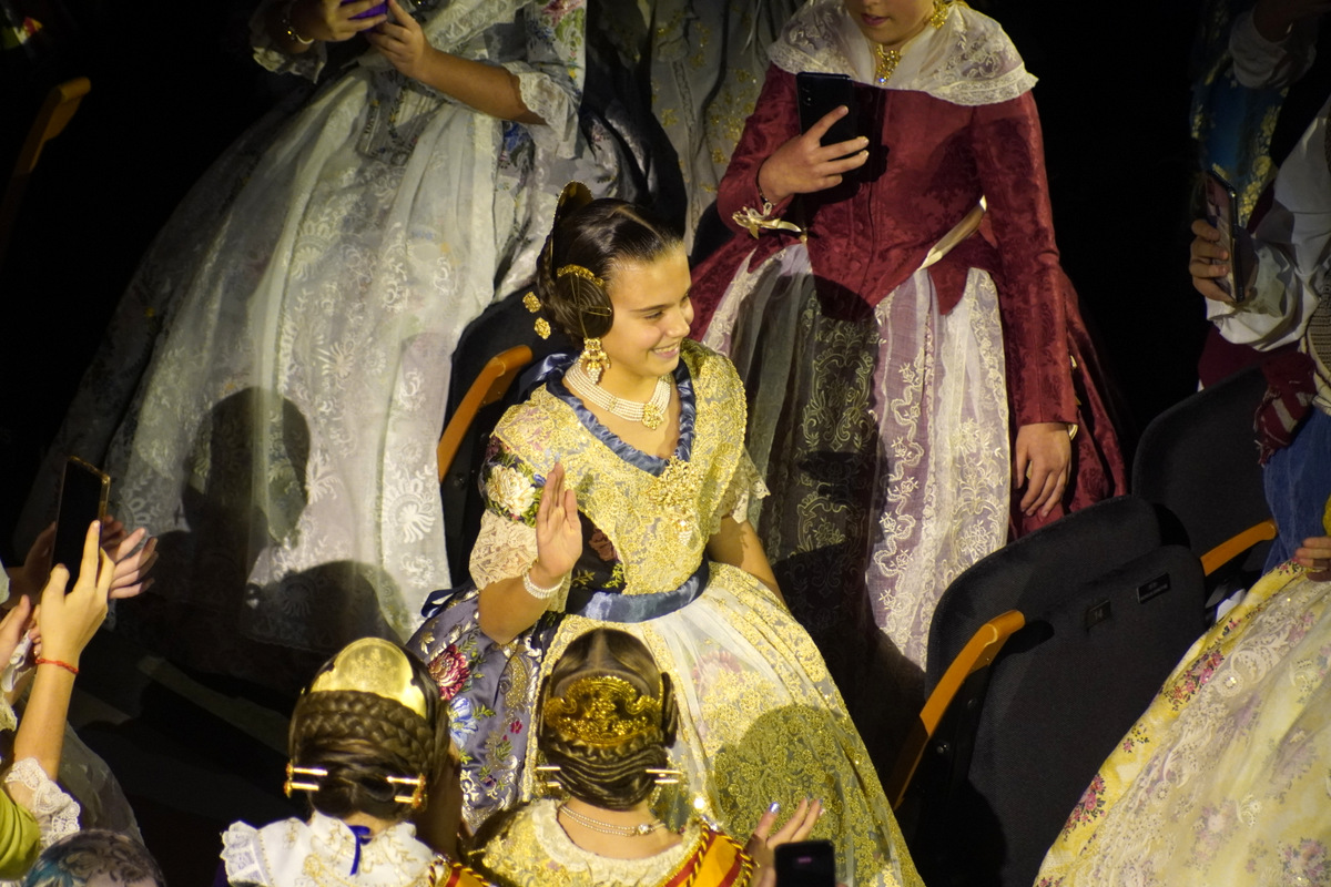 Marina, ahora sí ya dignísima portadora de la más alta representación, la de Fallera Mayor Infantil de Valencia para las Fallas de 2024, saludaba en todo su esplendor a los presentes visiblemente emocionada.
