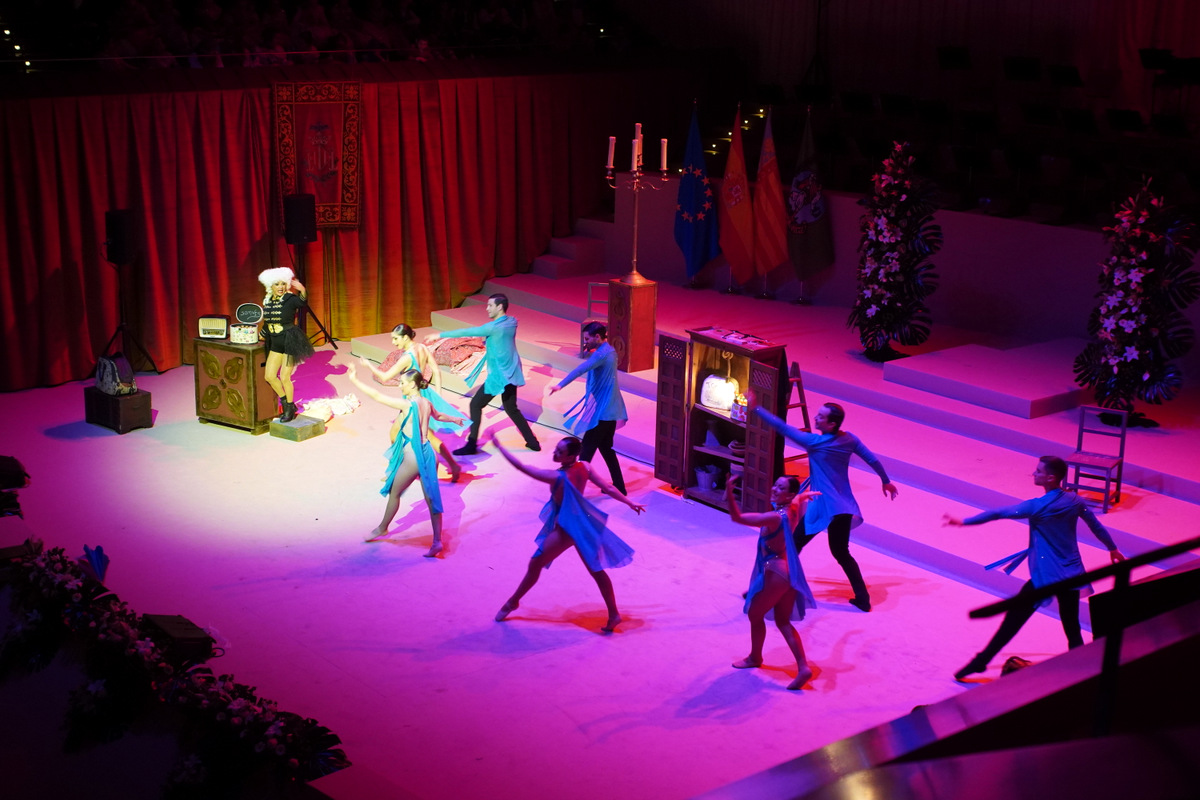 JM Gestión Teatral, la compañía encargada de poner en escena el espectáculo de la Exaltación, desplegaba sobre el escenario de la sala Iturbi una amalgama de números de circo, danza, magia y canciones, girando todo el conjunto sobre la idea, concepto y objetivos de una Valencia más sostenible y verde, una Valencia Capital Verde Europea, por un lado; y también la importancia de luchar por lograr los sueños personales, como el que Marina García Arribas tuvo desde que era muy pequeña de llegar a ser Fallera Mayor Infantil de Valencia. Los sueños se hacen realidad.