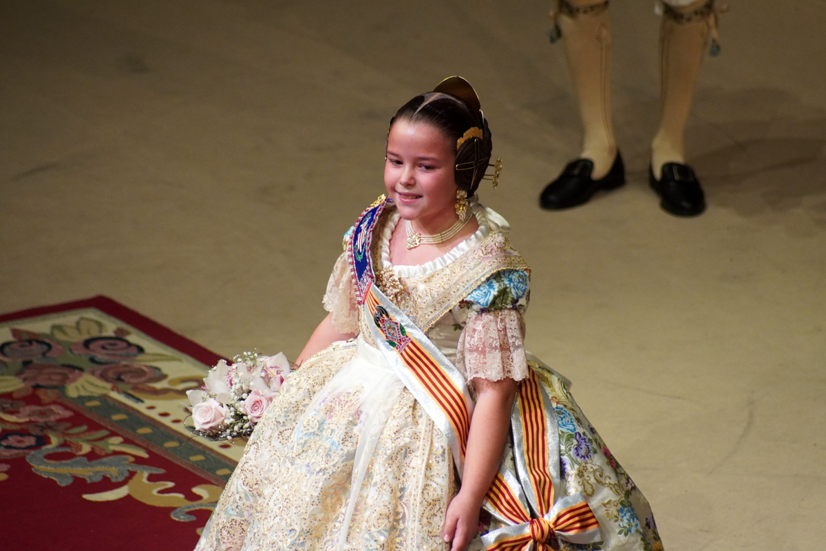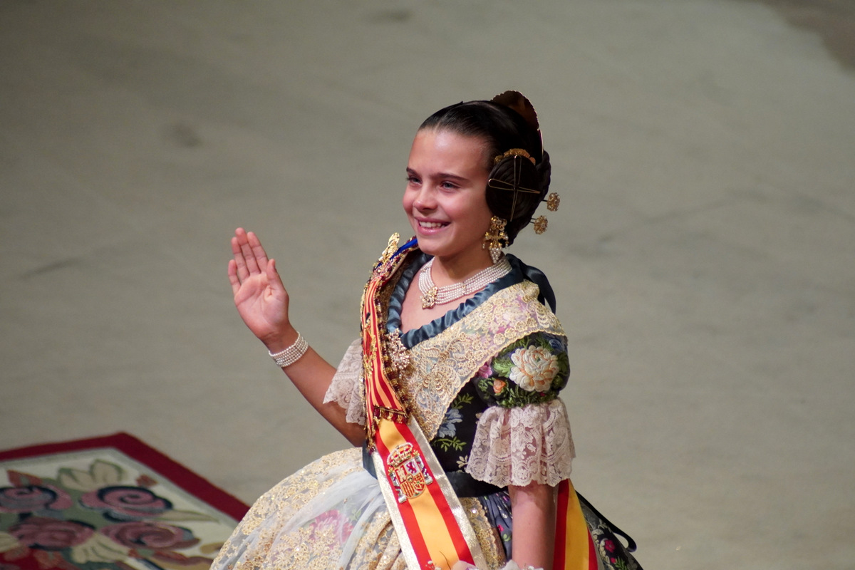 Marina, ahora sí ya dignísima portadora de la más alta representación, la de Fallera Mayor Infantil de Valencia para las Fallas de 2024, saludaba en todo su esplendor a los presentes visiblemente emocionada.
