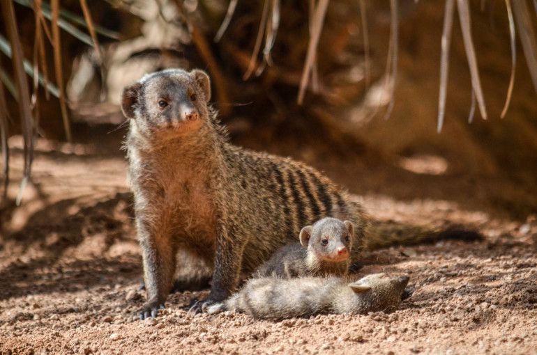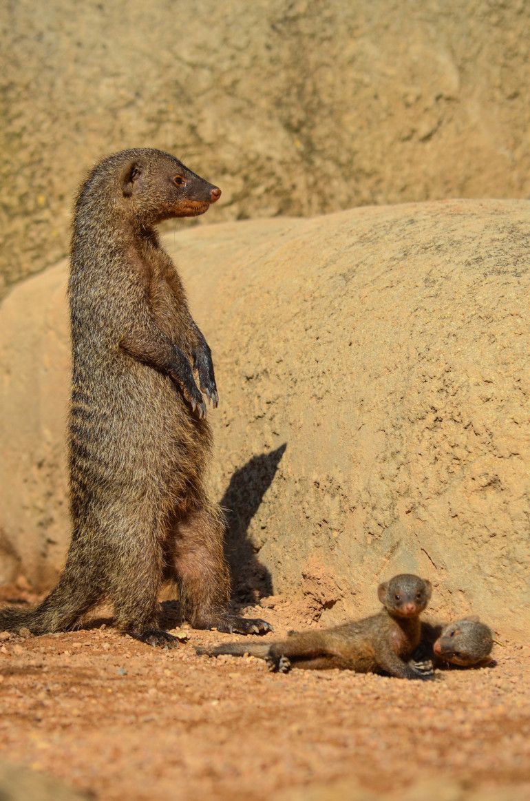 El verano sigue siendo un buen momento para los nacimientos, especialmente de las especies que habitan en las zonas de la sabana que recrea fielmente Bioparc Valencia. Y en uno de los espacios más interesantes al mostrar los típicos Kopjes que utilizan los leones como atalayas, nos encontramos un grupo de 12 mangostas rayadas (Mungos mungo), 6 adultas y 6 crías. Las pequeñas, con sus juegos e imitando continuamente los quehaceres propios de la especie, son un gran atractivo para los visitantes que pueden apreciar así el valor de la conservación de la biodiversidad. Son animales diurnos, carnívoros y muy sociales que viven en grupos matriarcales, cuyas hembras sincronizan los partos que pueden ser de 2 a 6 crías. Marcan cada día su territorio compartiendo todos los miembros el mismo olor y usan llamadas monosilábicas que contienen estructuras similares a las vocales y consonantes que utilizamos los humanos.