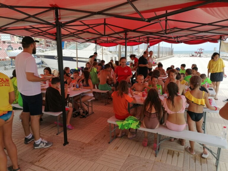 Los pequeños también se han bañado en la playa y además ha habido una gran paella para todos que han «devorado», porque realmente tenían hambre después de la intensa mañana. Y de nuevo por la tarde otro baño en el mar, jugando con las olas y la arena en la playa antes de volver al campamento por la tarde.